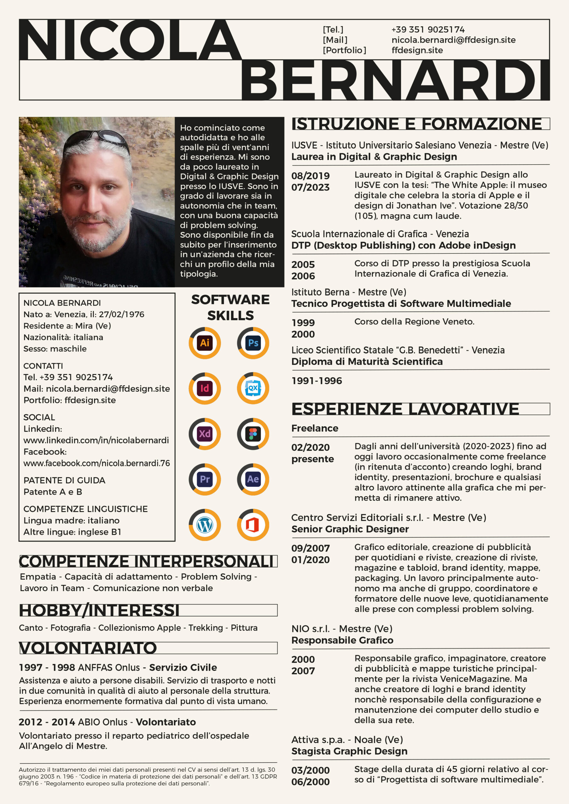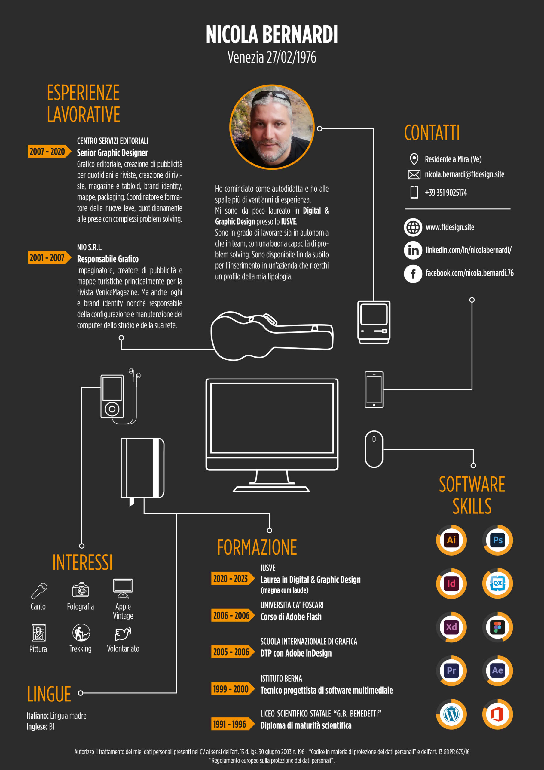 Ho cominciato a lavorare nel mondo della grafica da autodidatta, ho frequentato dei corsi per migliorare e colmare delle lacune, ho alle spalle più di venticinque di esperienza e ora mi sono laureato in Digital & Graphic Design allo IUSVE. Dai lavori precedenti ho imparato principalmente a risolvere problemi cercando, a seconda delle circostanze, la soluzione più rapida o più creativa appellandomi talvolta alla razionalità e talvolta al pensiero laterale.