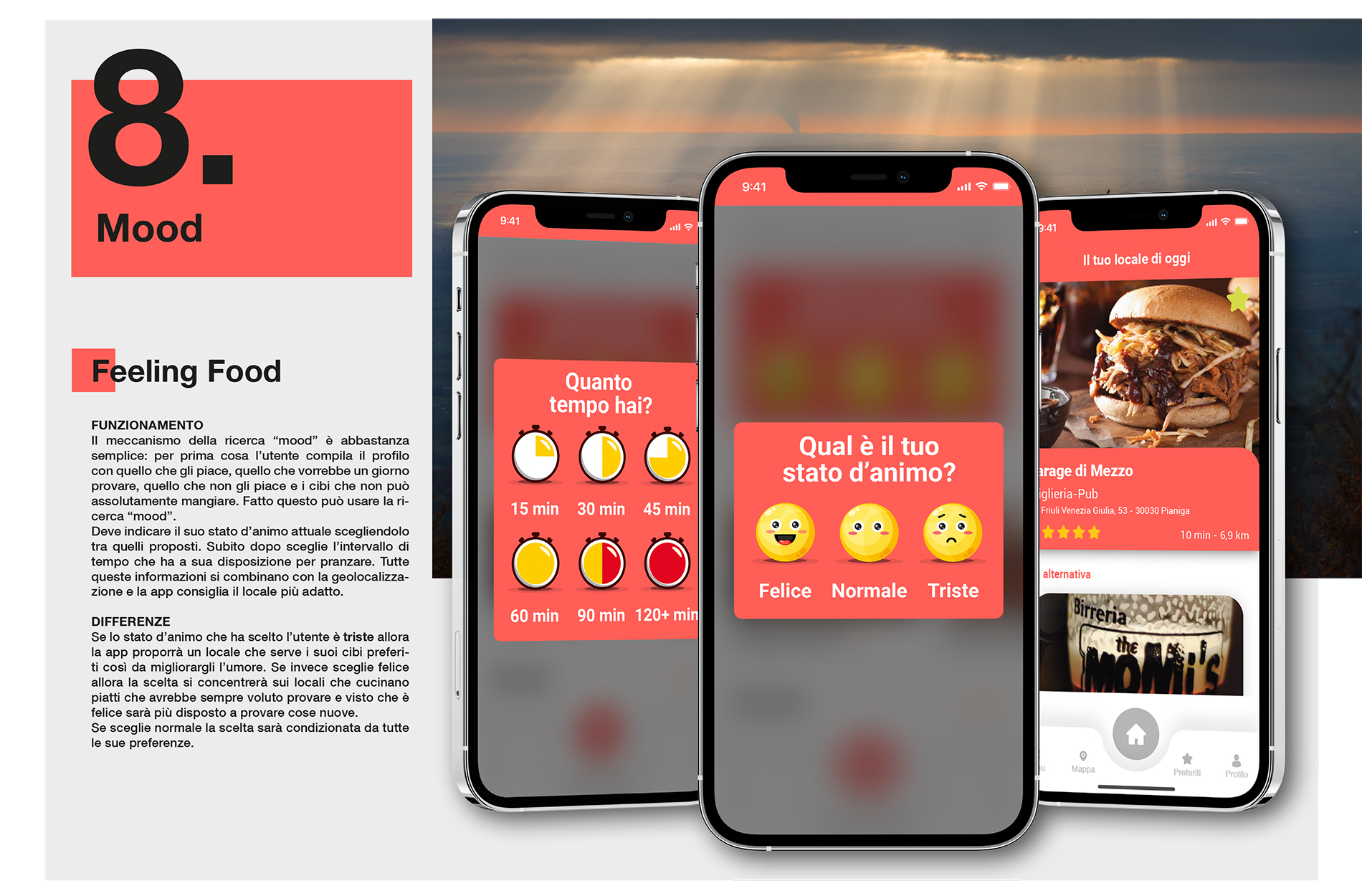Creazione del prototipo di un’app che aiuti le persone a decidere dove pranzare, realizzata per l’esame del corso di “UX/UI Design”. L’app presenta, oltre alle consuete possibilità di ricerca, una modalità speciale basata sullo stato d’animo dell’utente. Nelle immagini alcune fasi del processo creativo.