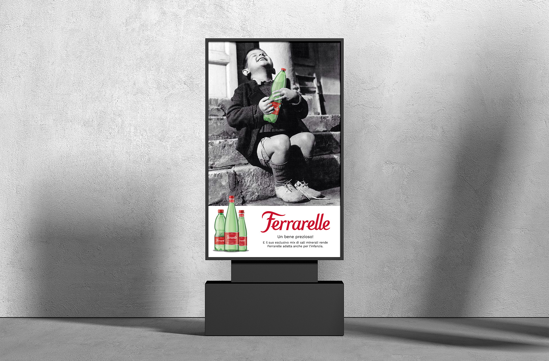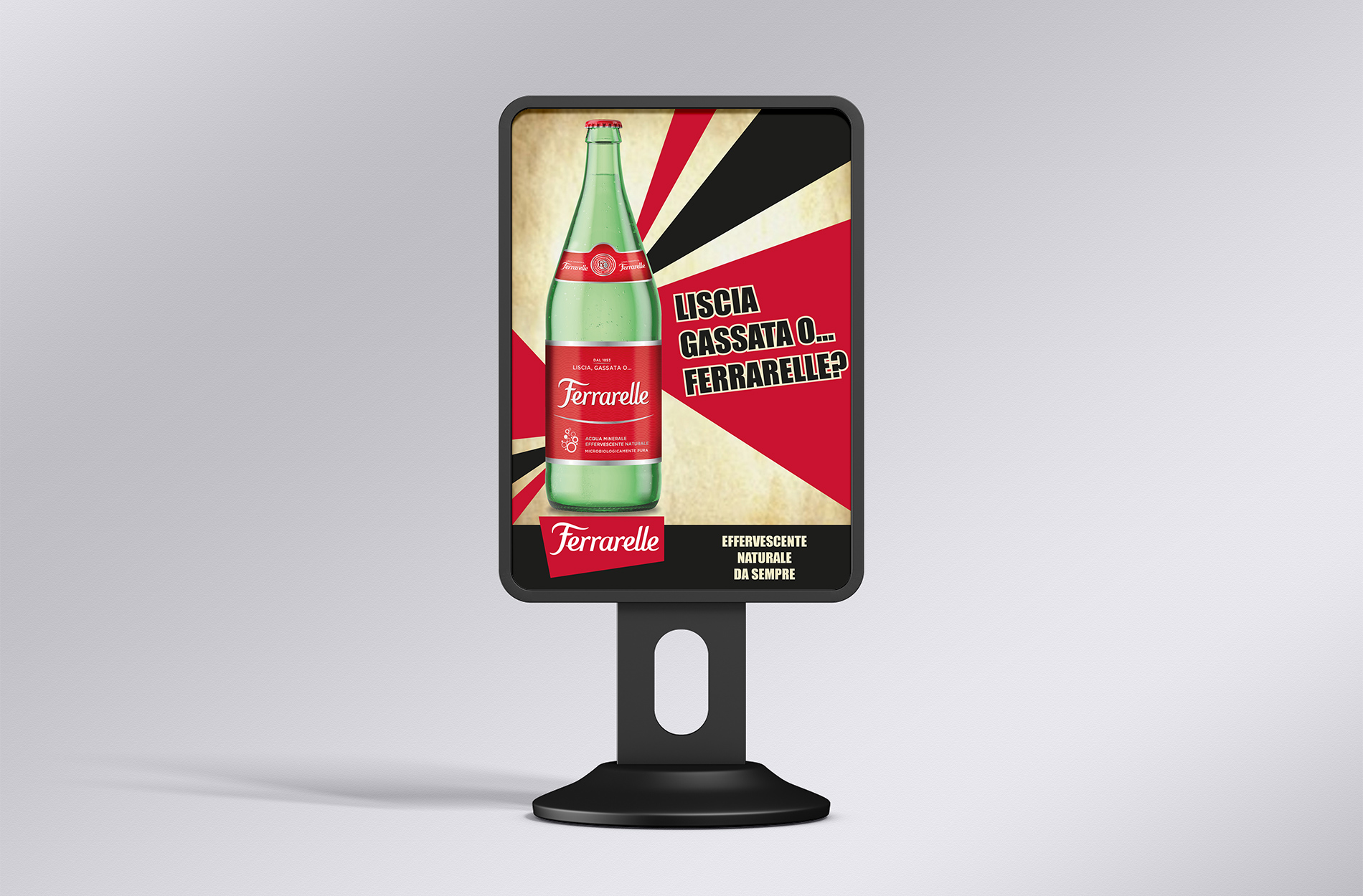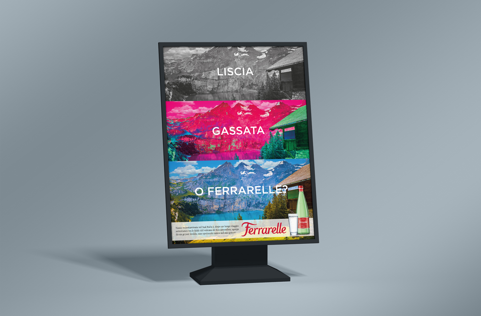 Creazione di cinque pubblicitĂ per il fittizzio cliente Ferrarelle declinate in cinque tipologie diverse: Citazione Artistica, Cartellonistica, Emozionale, Negative Approach e Sinestesia. Progetto creato per l’esame di “Linguaggi e strategie dell’advertising”.