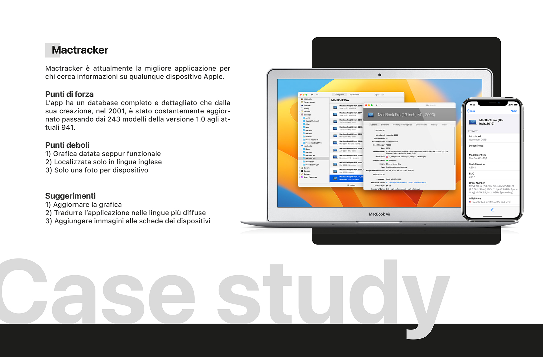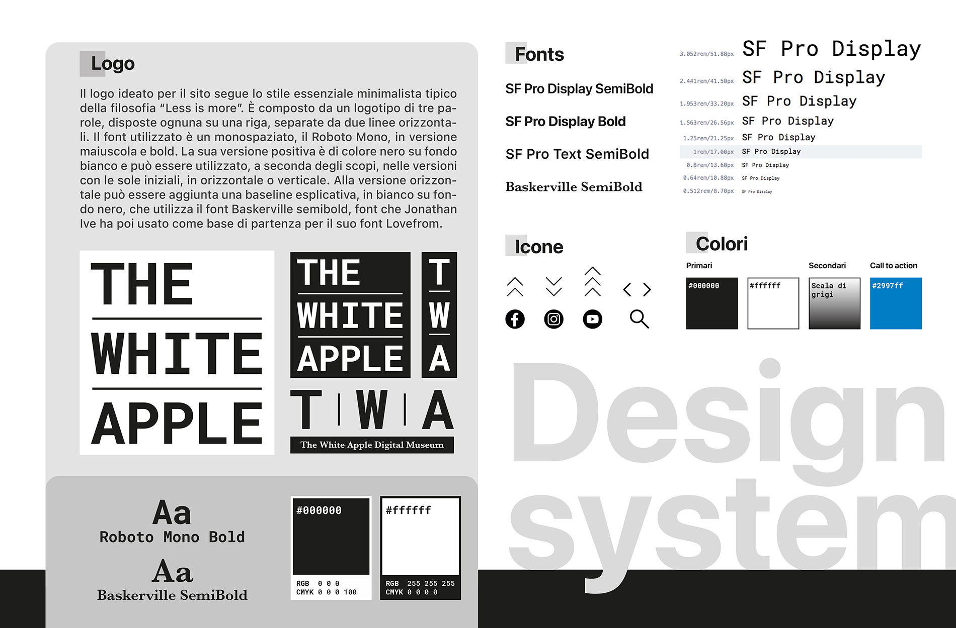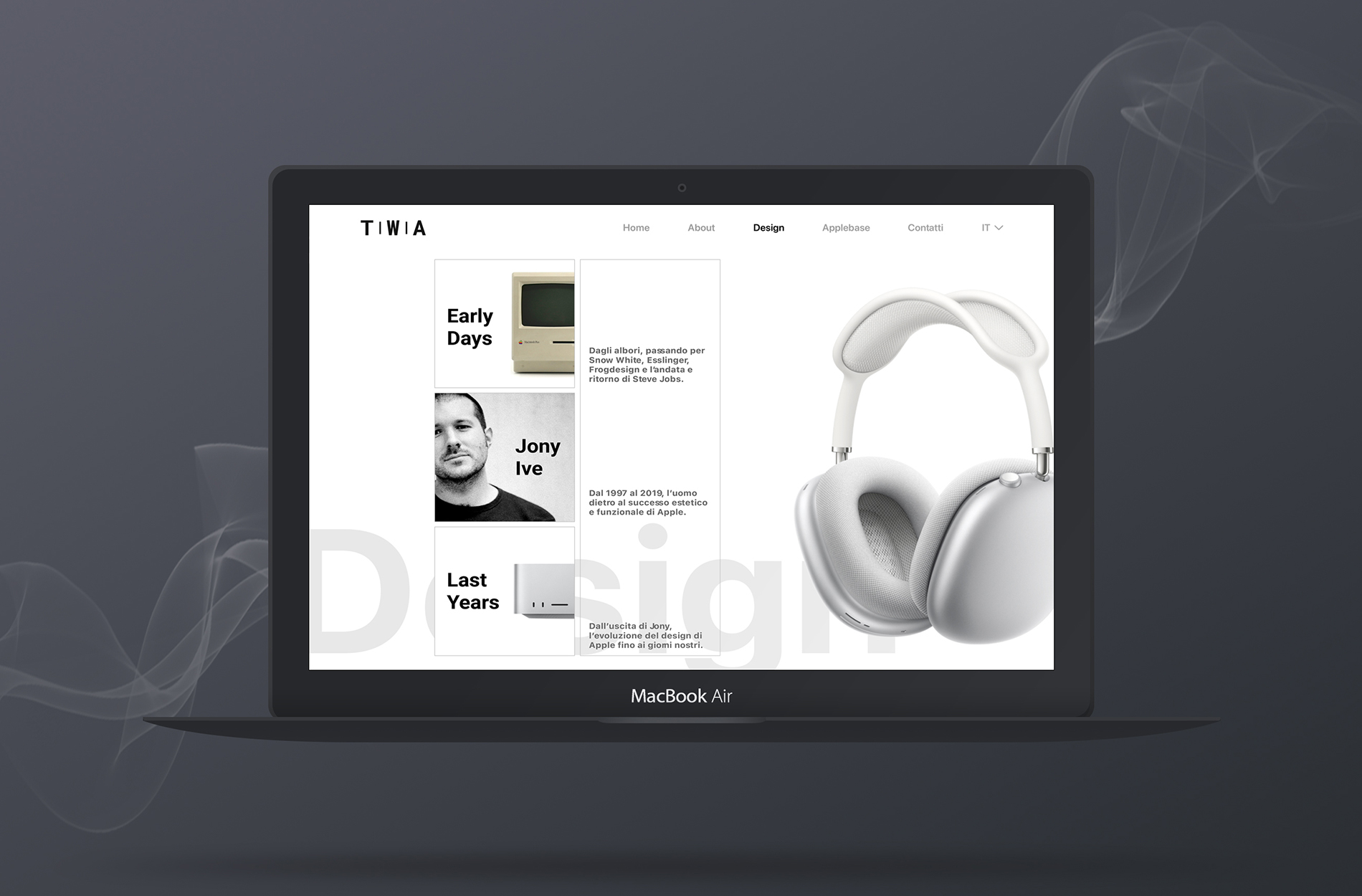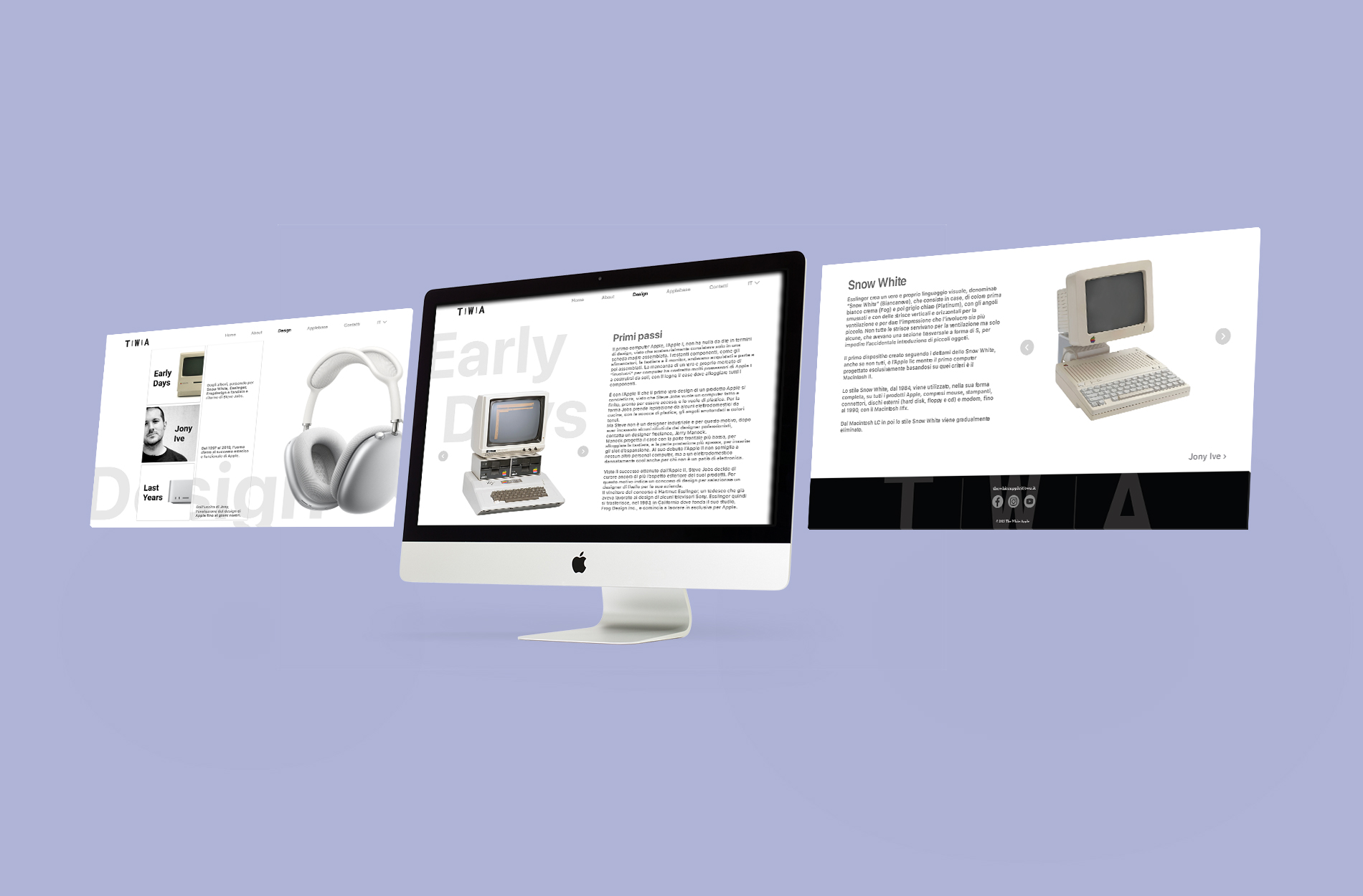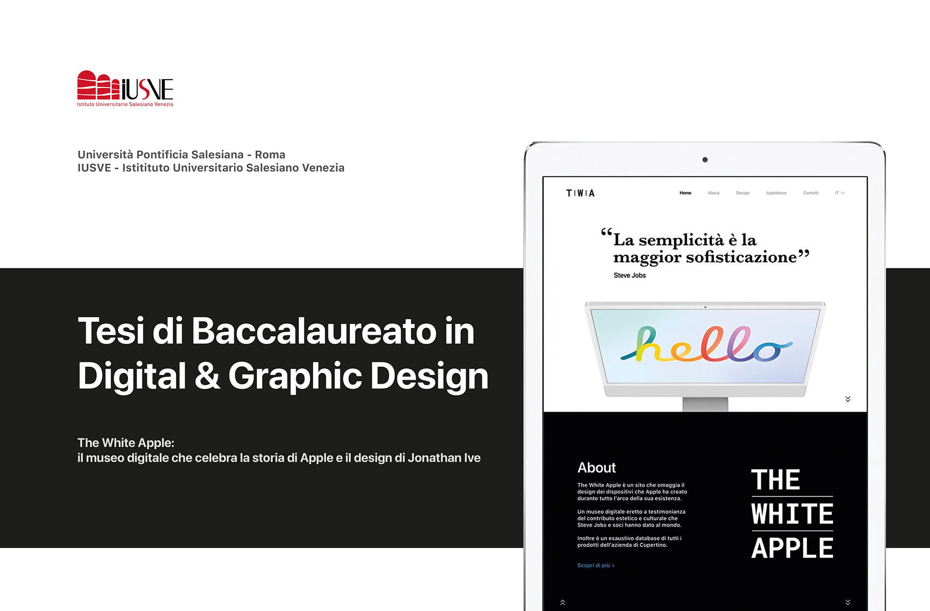 Progetto di tesi di laurea in Digital & Graphic Design, dal titolo “The White Apple: il museo digitale che celebra la storia di Apple e il design di Jonathan Ive”. La tesi ripercorre l’intera storia di Steve Jobs e di Apple, con particolare attenzione alla figura di Jonathan Ive e del suo design. Il progetto pratico è un sito, The White Apple, che si divide sostanzialmente in due parti: la prima si occupa minuziosamente della storia di Apple, dalla sua nascita ai giorni nostri, con particolare attenzione al design e ai suoi designer. La seconda, chiamata Applebase, è un database che cataloga i dati tecnici di tutti i dispositivi Apple, dall’Apple I fino agli ultimi dispositivi basati su Apple Silicon M3, passando per i più piccoli accessori.